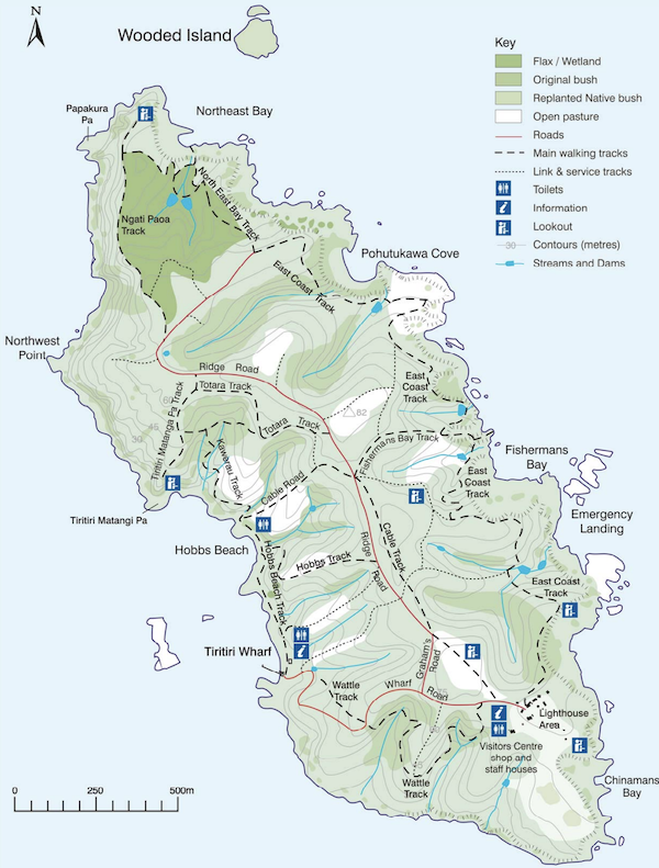 The Tiritiri Matangi Nature Reserve website has information on the multiple Guided Walks around the island, including elevation and restroom location information like this diagram for the Kawerau Track. However, the website didn’t let me choose a specific Track when purchasing the Guided Walk.