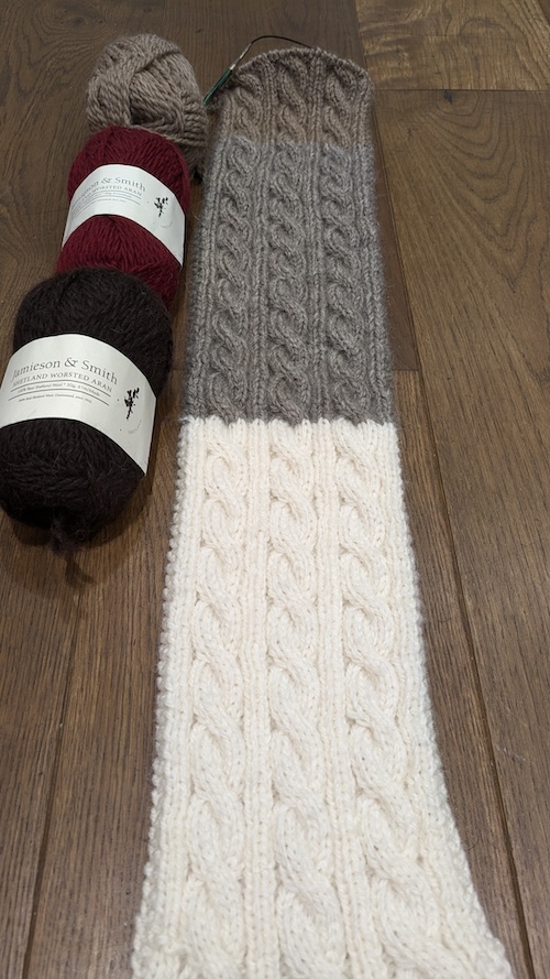 I’ve continued my goal to buy a new, locally grown yarn in every country I visit to make an “Around The World” scarf which I have been using to learn and practice cabling before making a cable scarf as a gift. Here’s where I am currently: