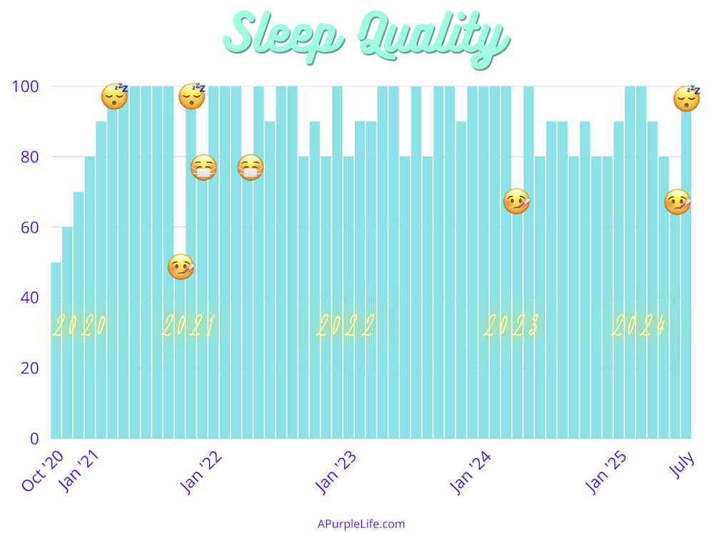 2. No – it’s much less scientific 🙂 . I just reflect throughout the month on how well I’m sleeping (if I fall asleep easily, stay asleep and feel rested when I wake up) and give a value 1-10 to the month overall.