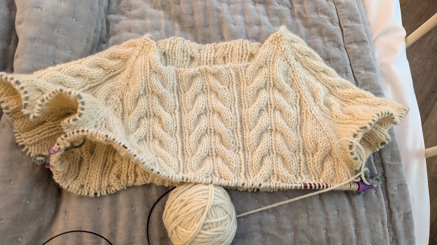 I made a few big mistakes (let me know if you can spot them ๐Ÿ˜‰ ), but it’s overall been a fun challenge and I’m enjoying the process and how much I’ve learned.  I also instituted a new rule that’s been nice: if I’m rewatching something I’ve seen before alone, such as YouTube, a TV show or a movie, I now have to knit during it. I still find the act of re-watching a comfort show relaxing, but by also knitting during it, I see constant progress which I also like.